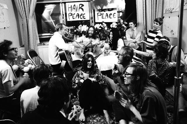 John&Yoko stage their second Bed-In For Peace in Montreal, Canada. On June 1st in room 1742 at the Queen Elizabeth Hotel they record the song, "Give Peace A Chance" on a rented 4 track. John and Tommy Smothers are playing acoustic guitars. In the room at the time are dozens of journalists and celebrities, including Allen Ginsberg, Abbie Hoffman, Timothy Leary, Petula Clark, Dick Gregory, DJ Murray the K, Apple's Derek Taylor, Rabbi Abraham Feinberg and members of the Radha Krishna Temple. Many of them were mentioned in the lyrics, either directly or allusively. The song is finished at 10pm. Later that night, John & Yoko also record Yoko’s song, “Remember Love” at 3am.